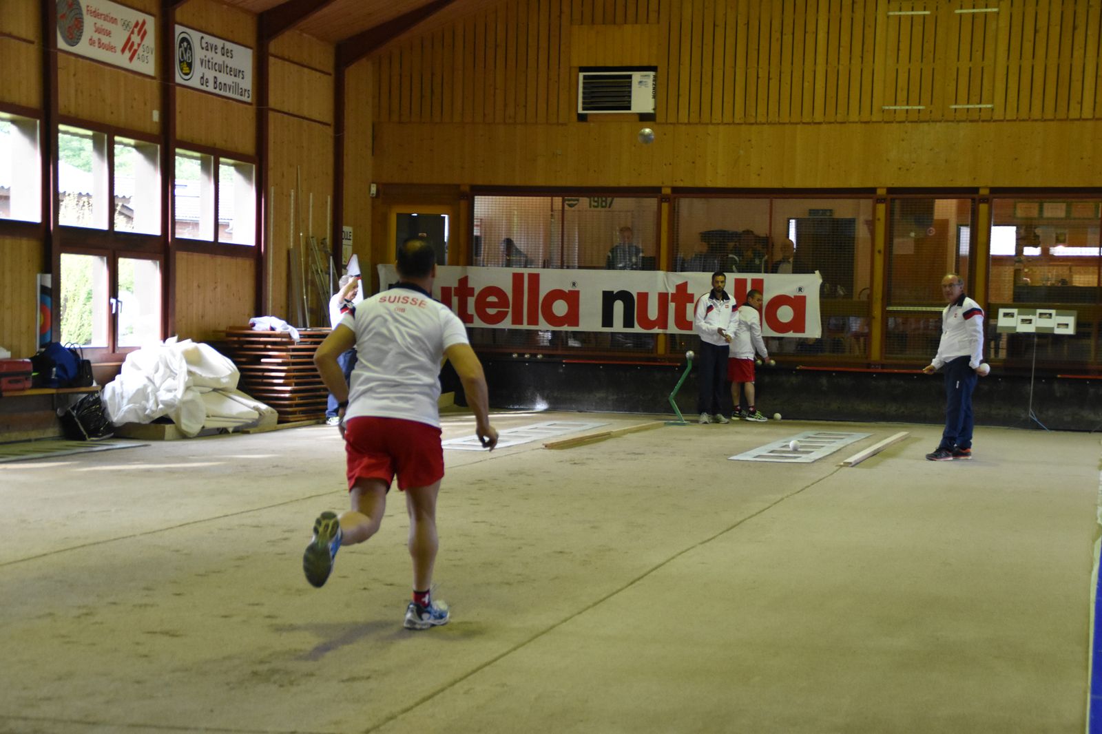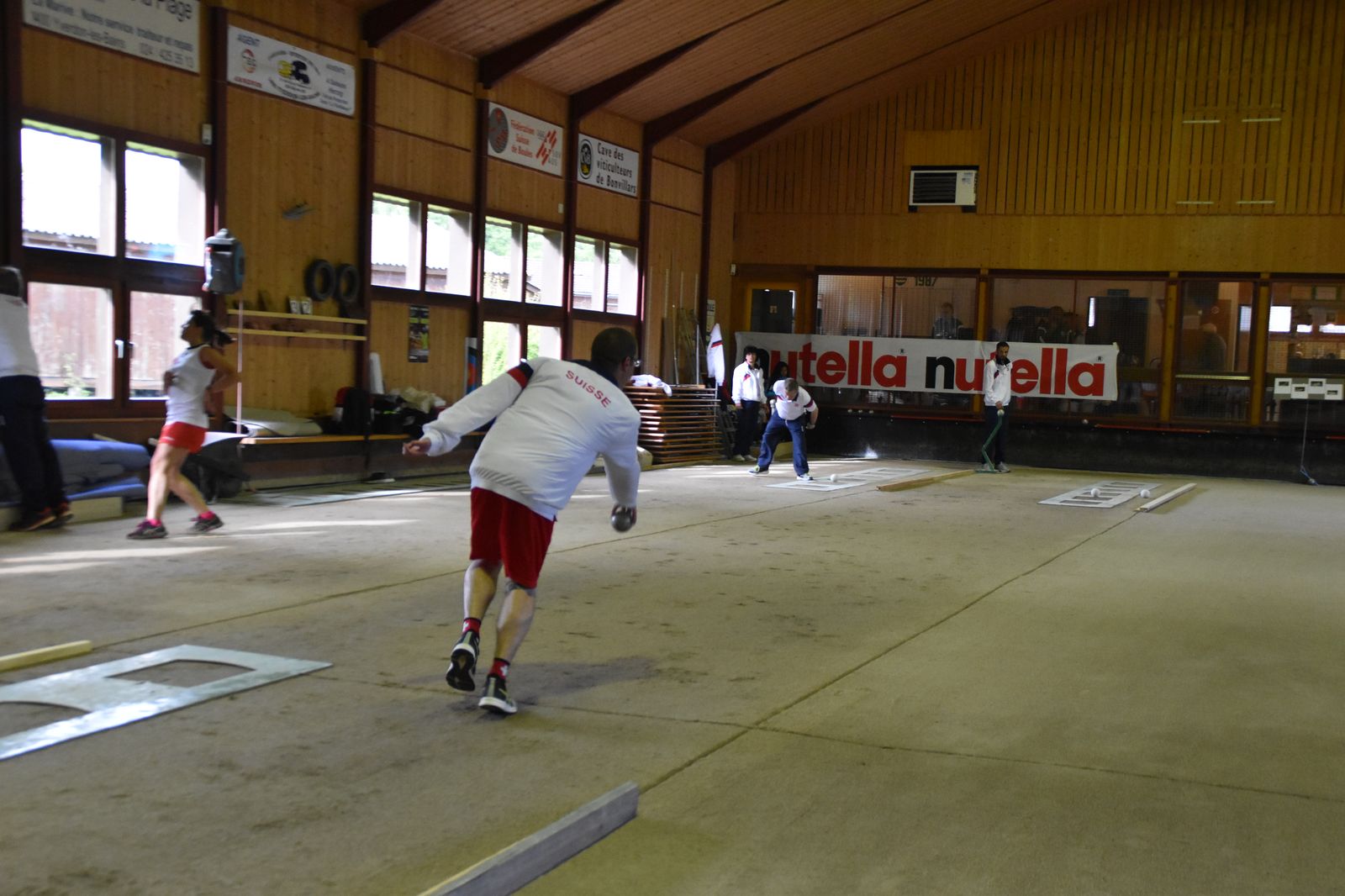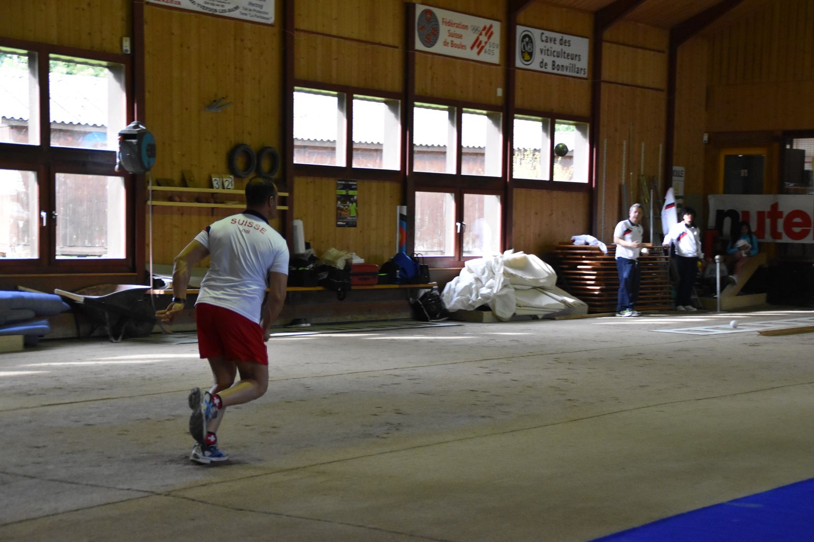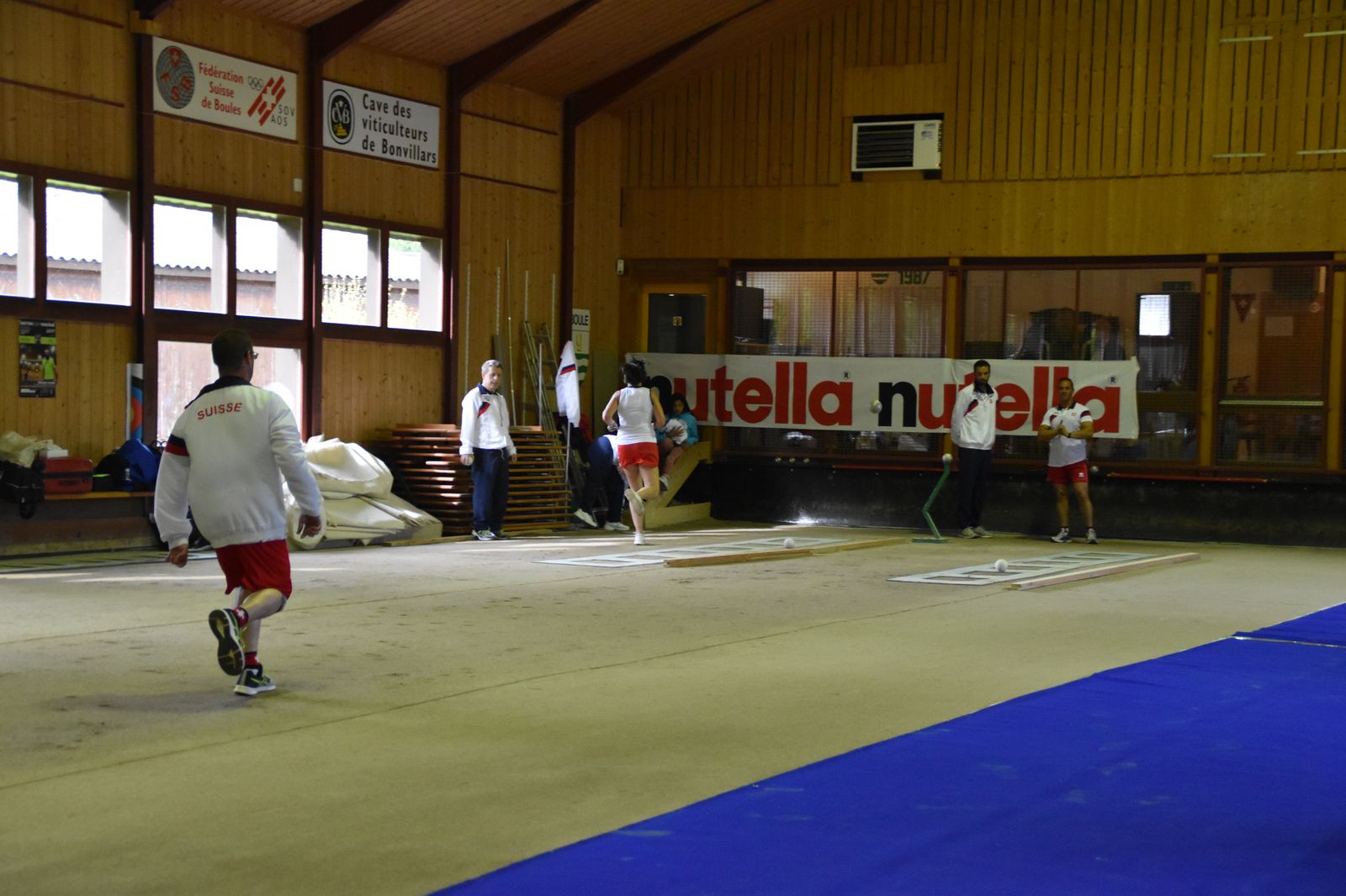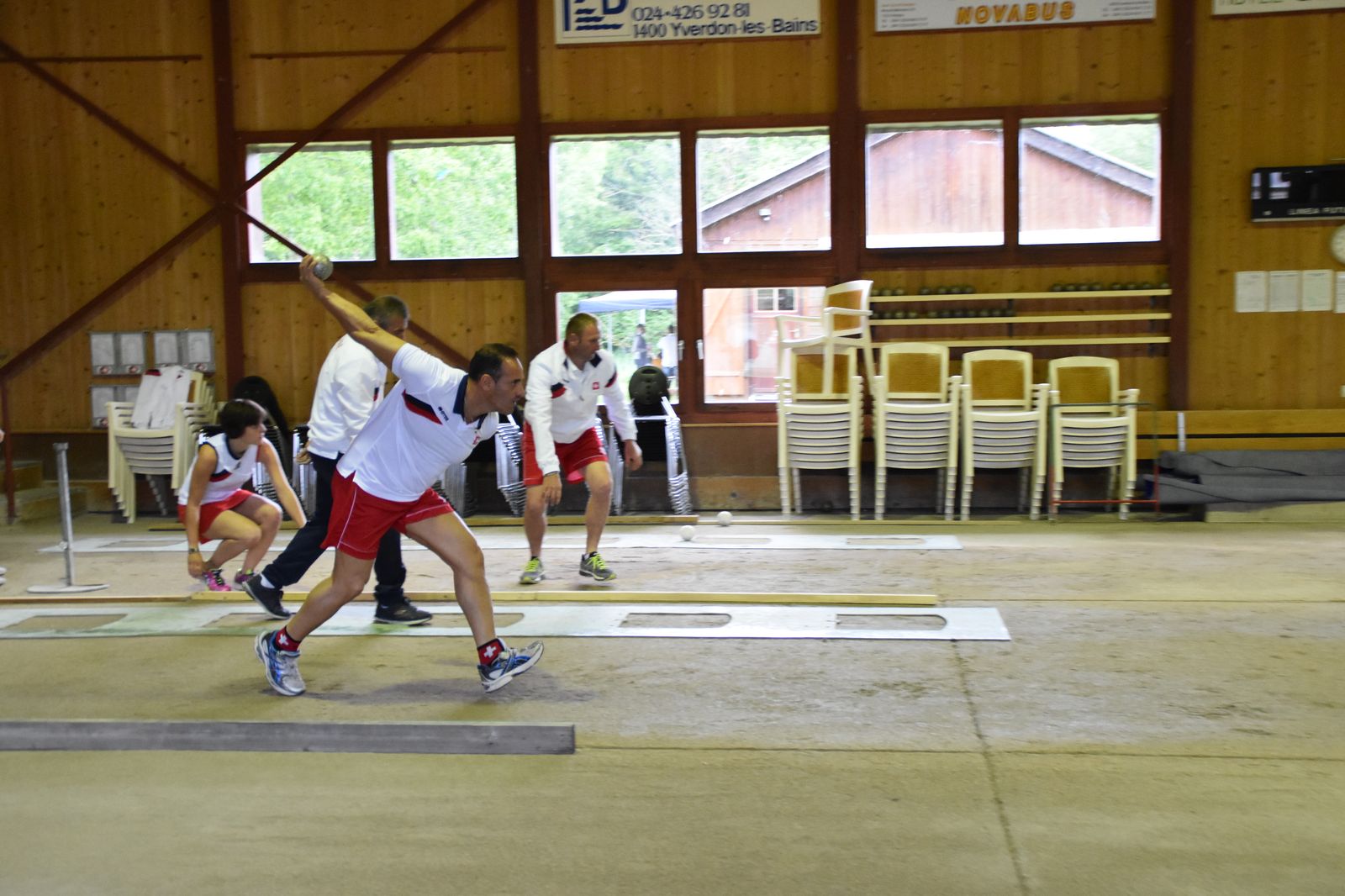 Boulodrome d'Yverdon-les-Bains et échauffement de l'équipe suisse pour sa démonstration.