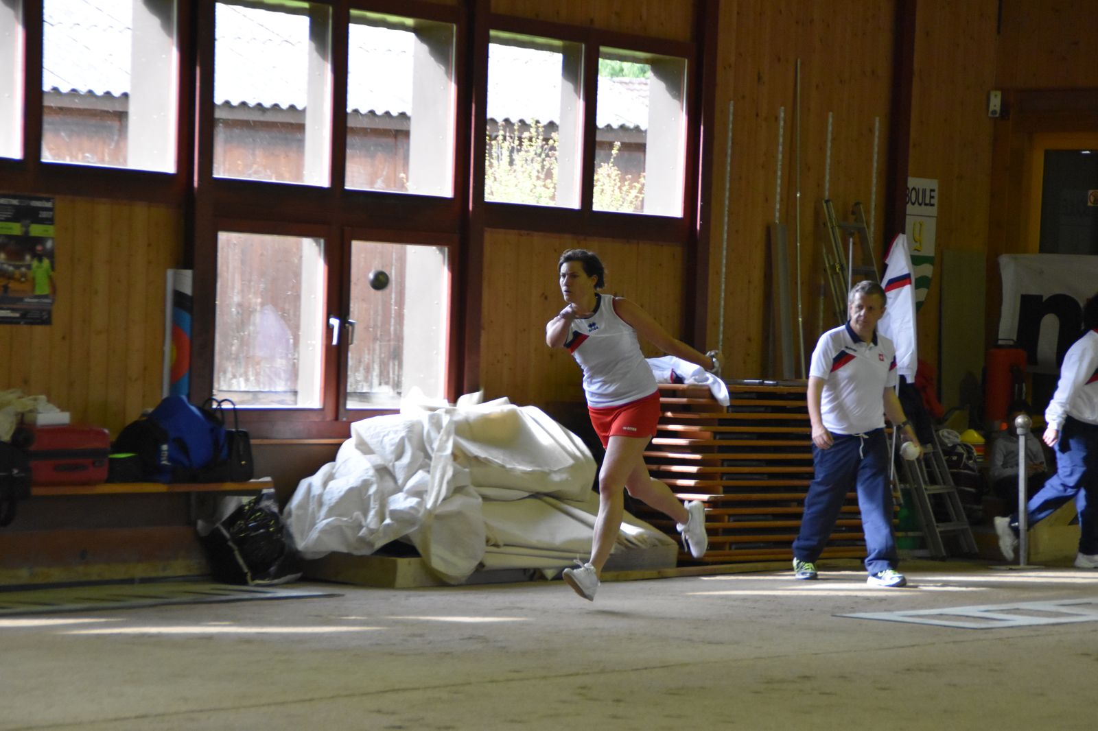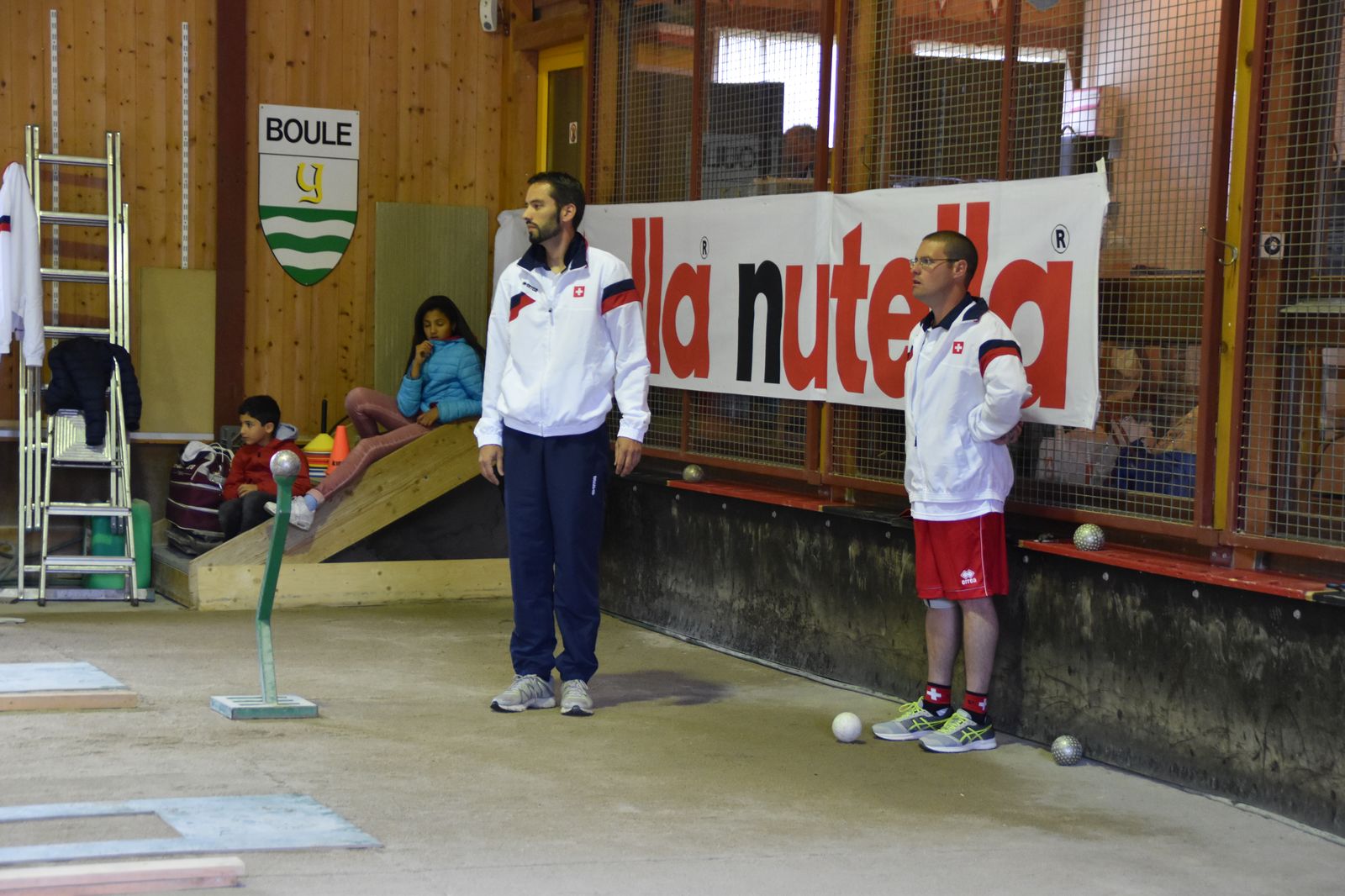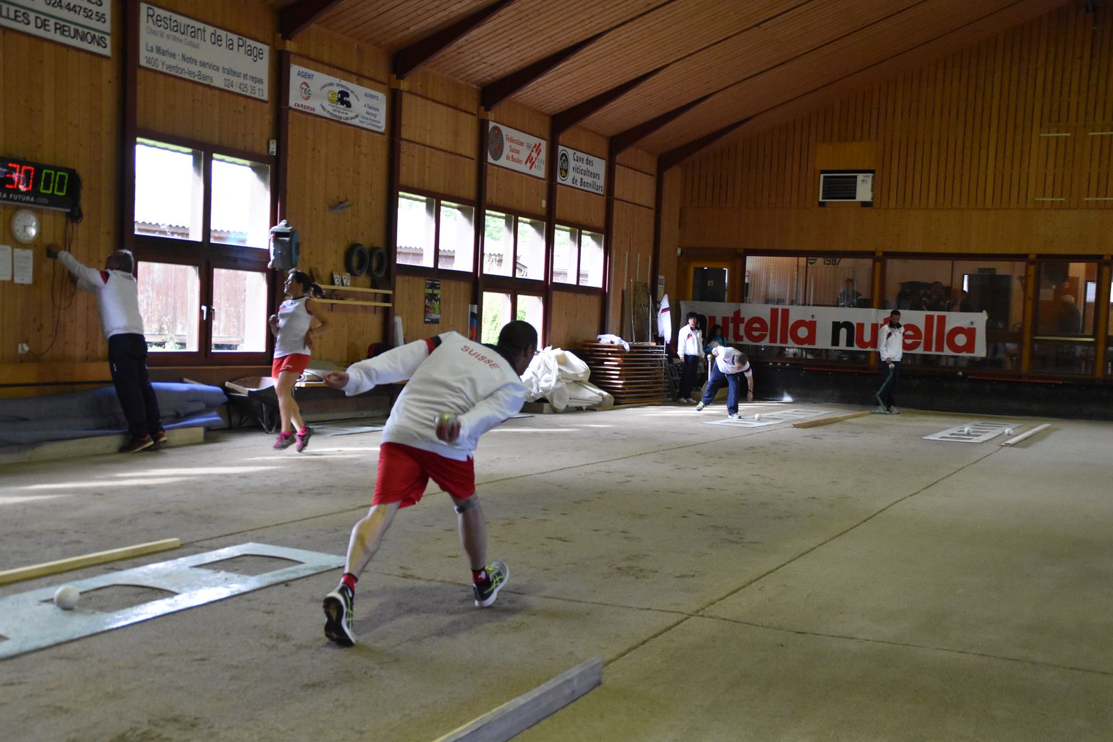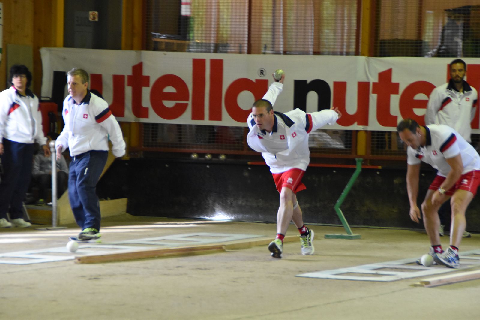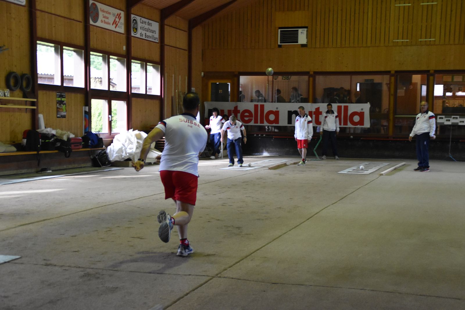 Boulodrome d'Yverdon-les-Bains et échauffement de l'équipe suisse pour sa démonstration.