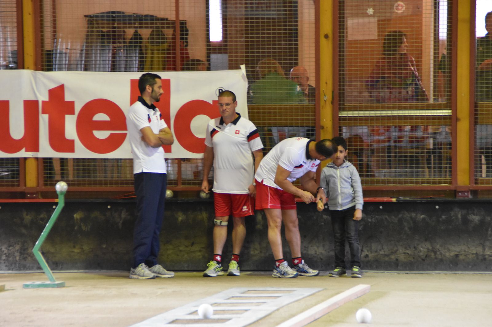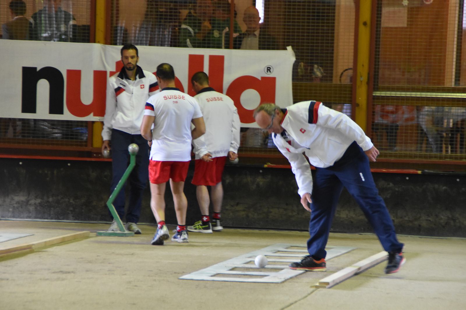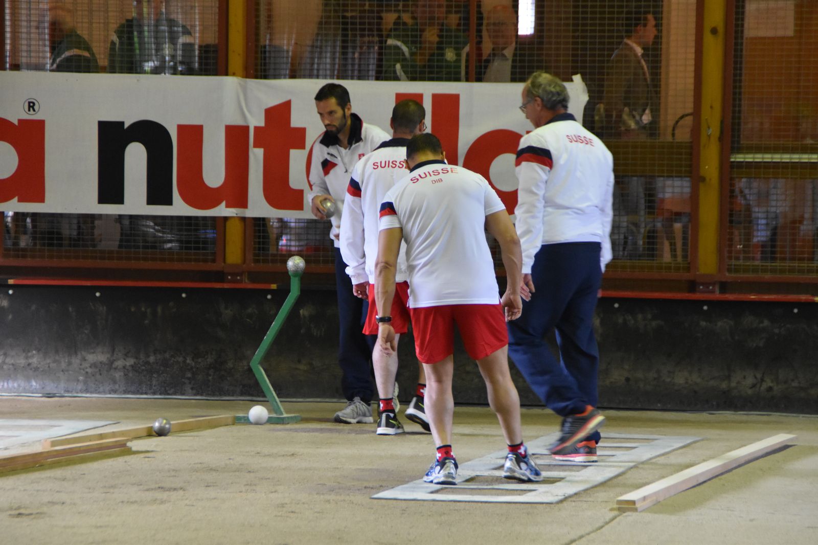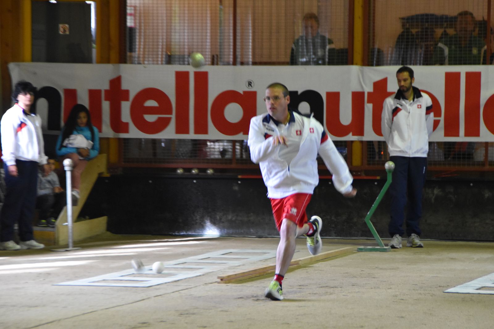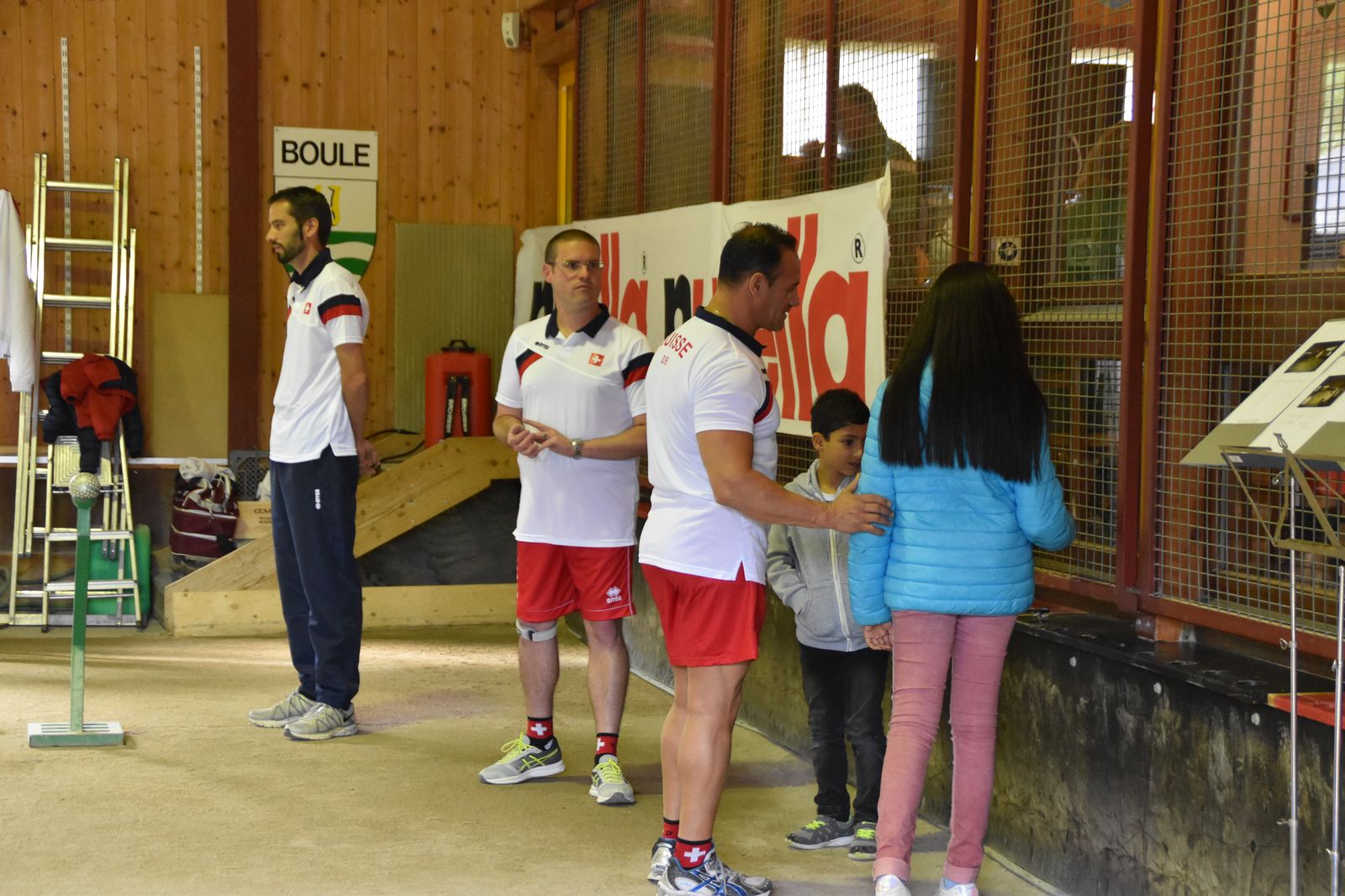 Boulodrome d'Yverdon-les-Bains et échauffement de l'équipe suisse pour sa démonstration.