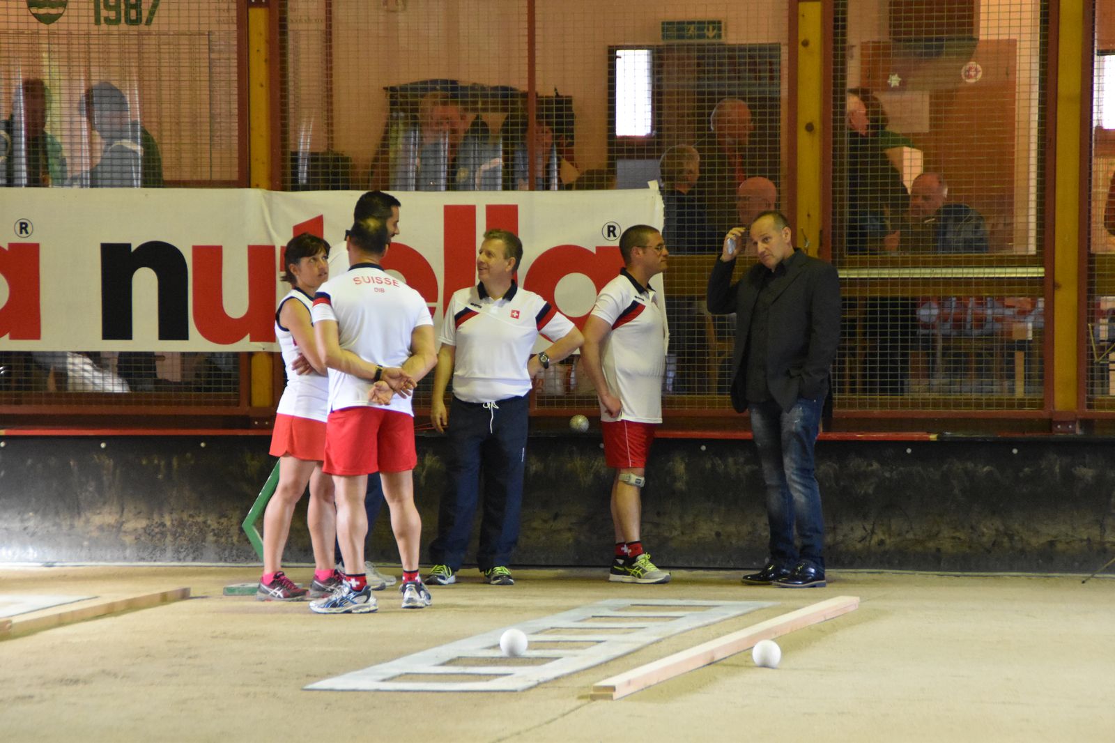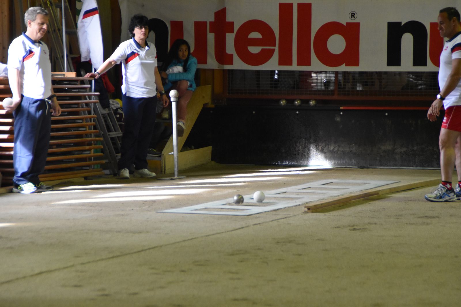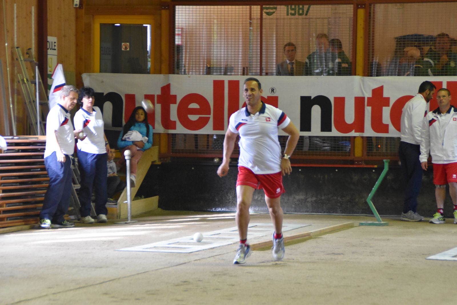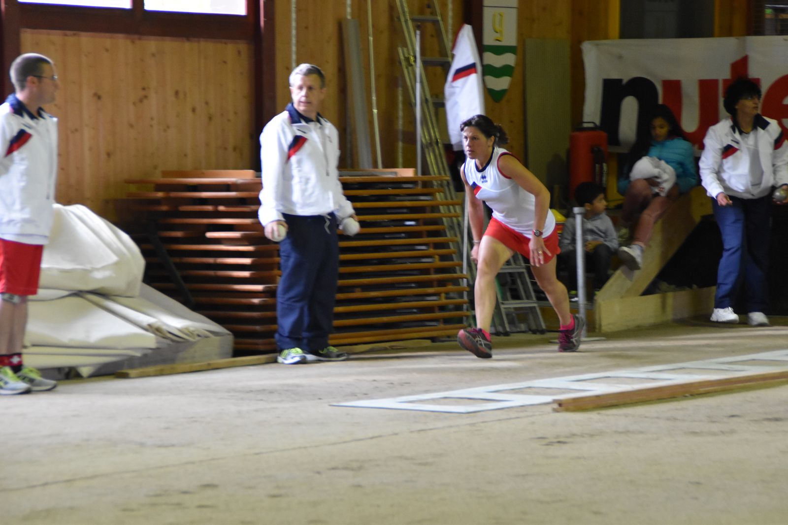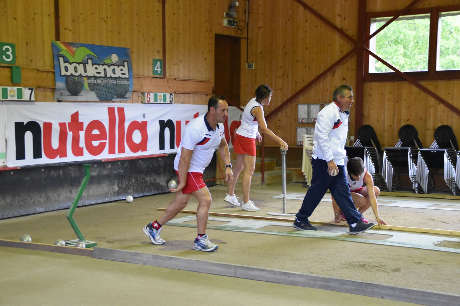Boulodrome d'Yverdon-les-Bains et échauffement de l'équipe suisse pour sa démonstration.