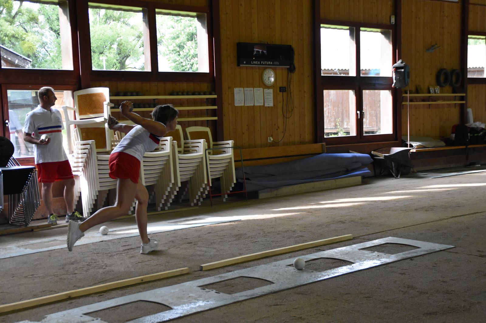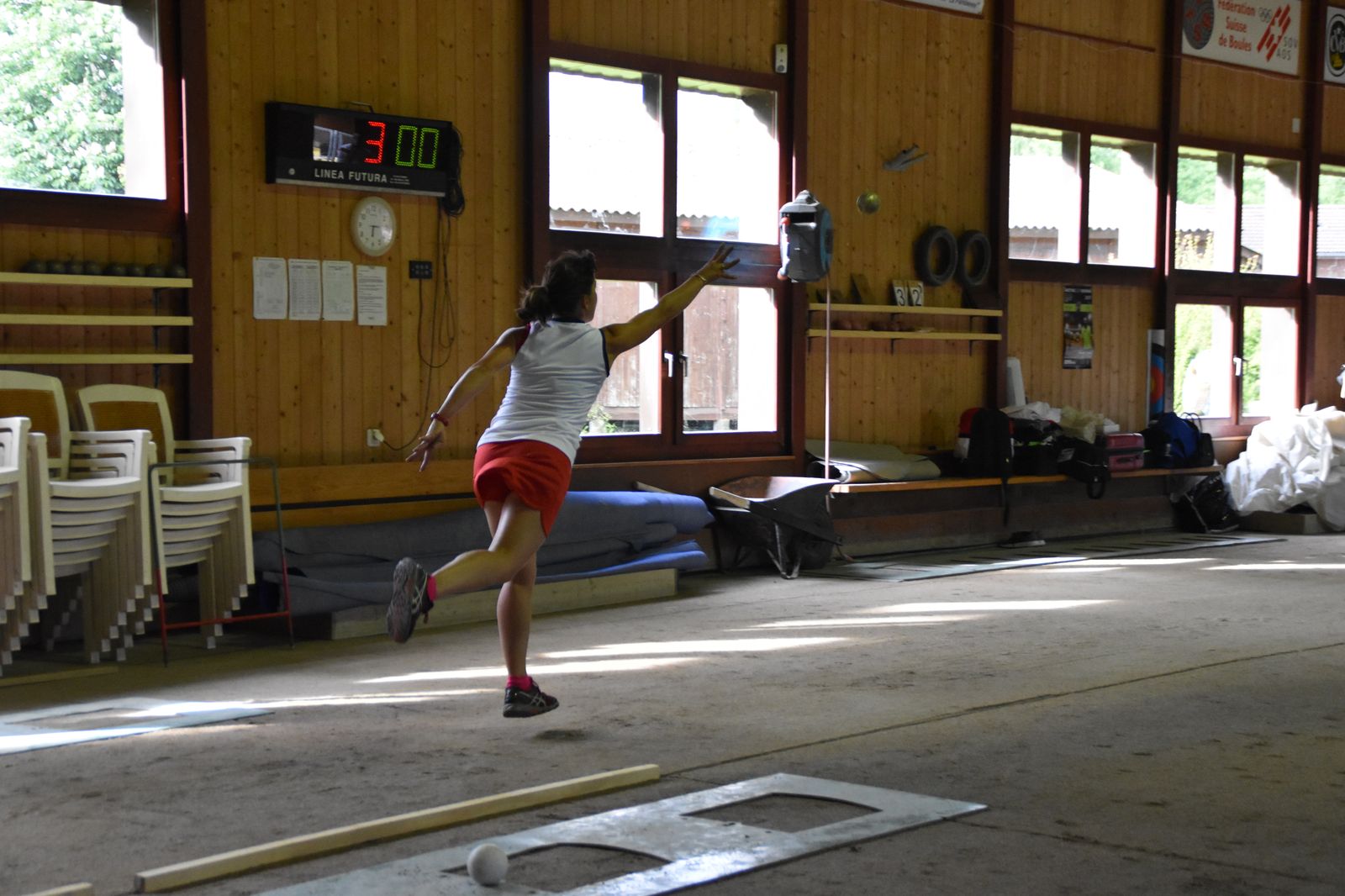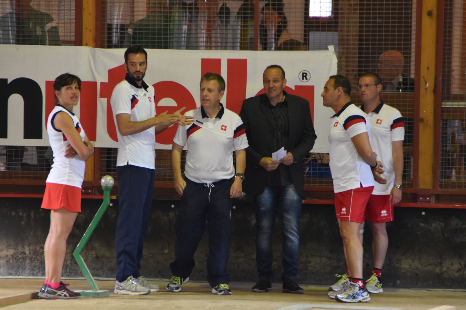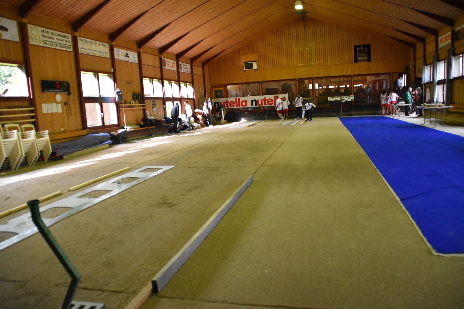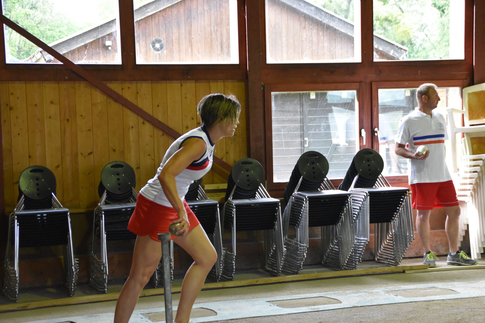 Boulodrome d'Yverdon-les-Bains et échauffement de l'équipe suisse pour sa démonstration.