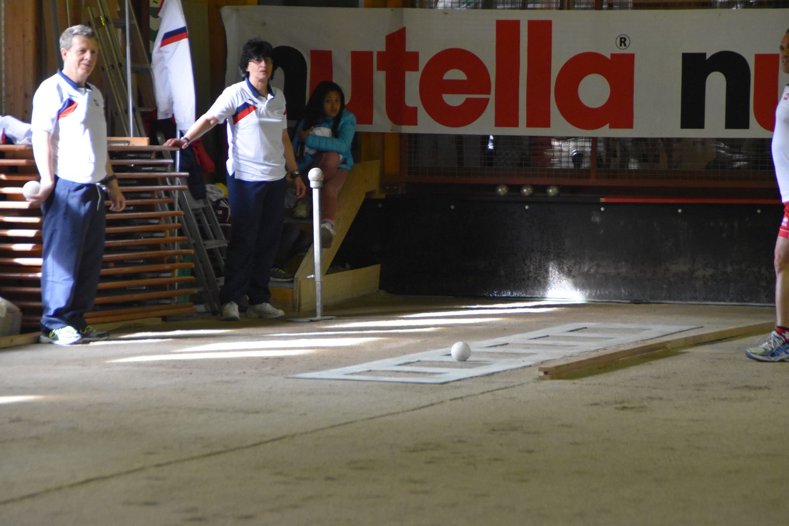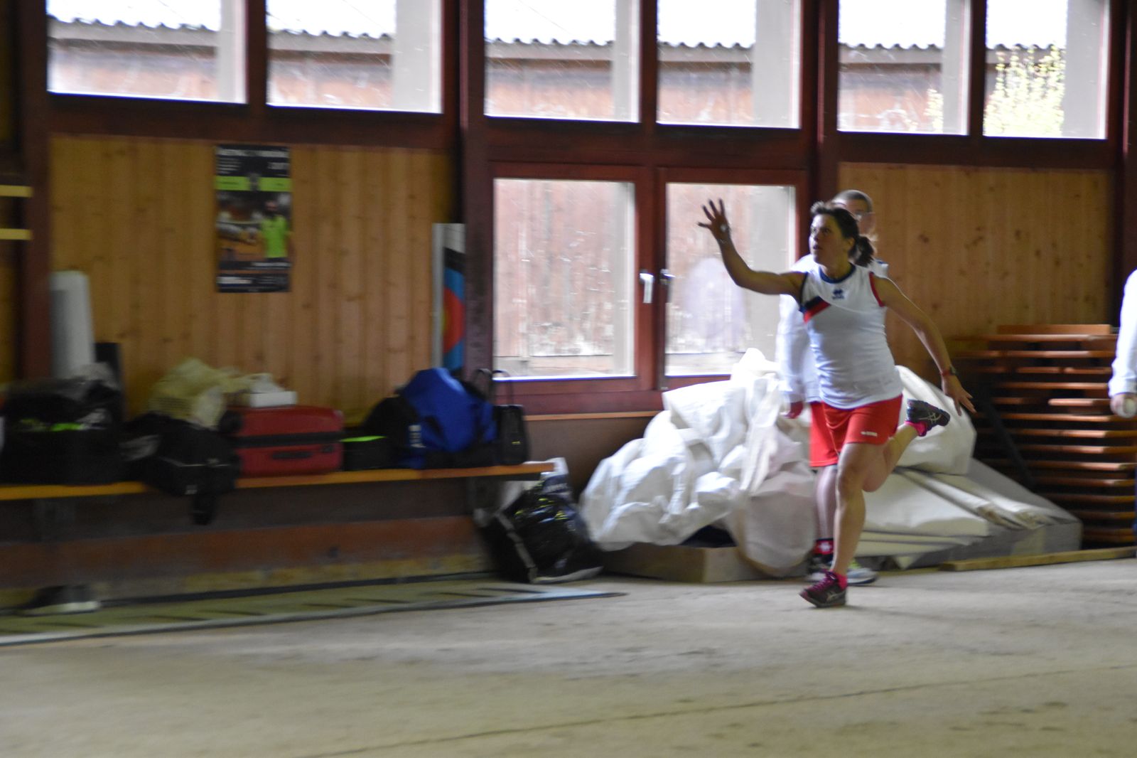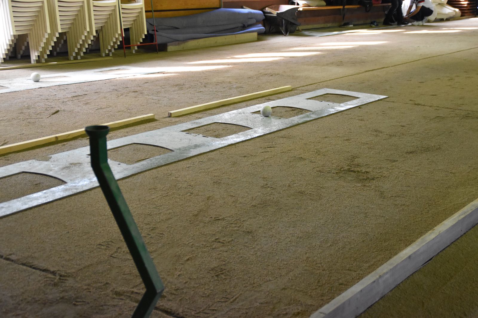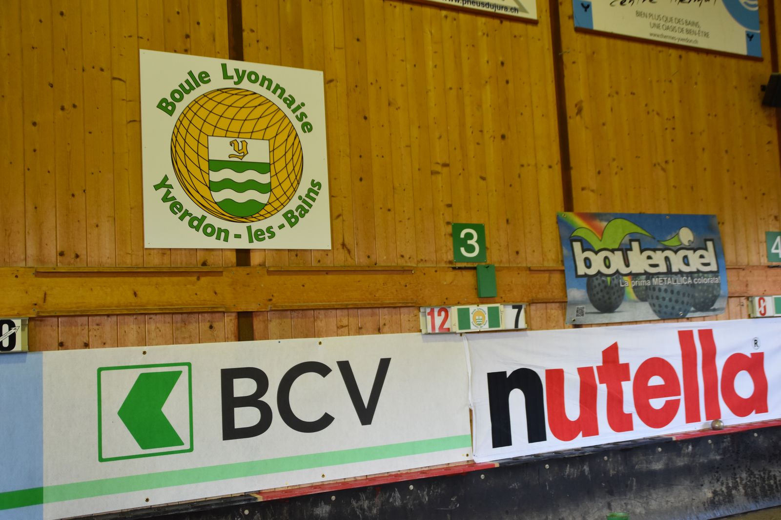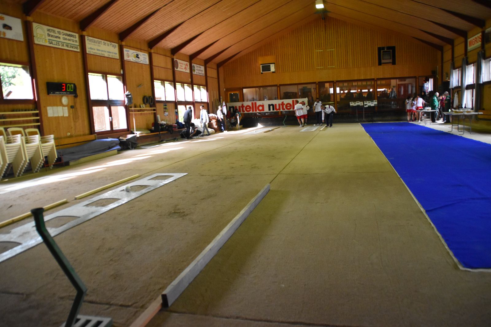 Boulodrome d'Yverdon-les-Bains et échauffement de l'équipe suisse pour sa démonstration.
