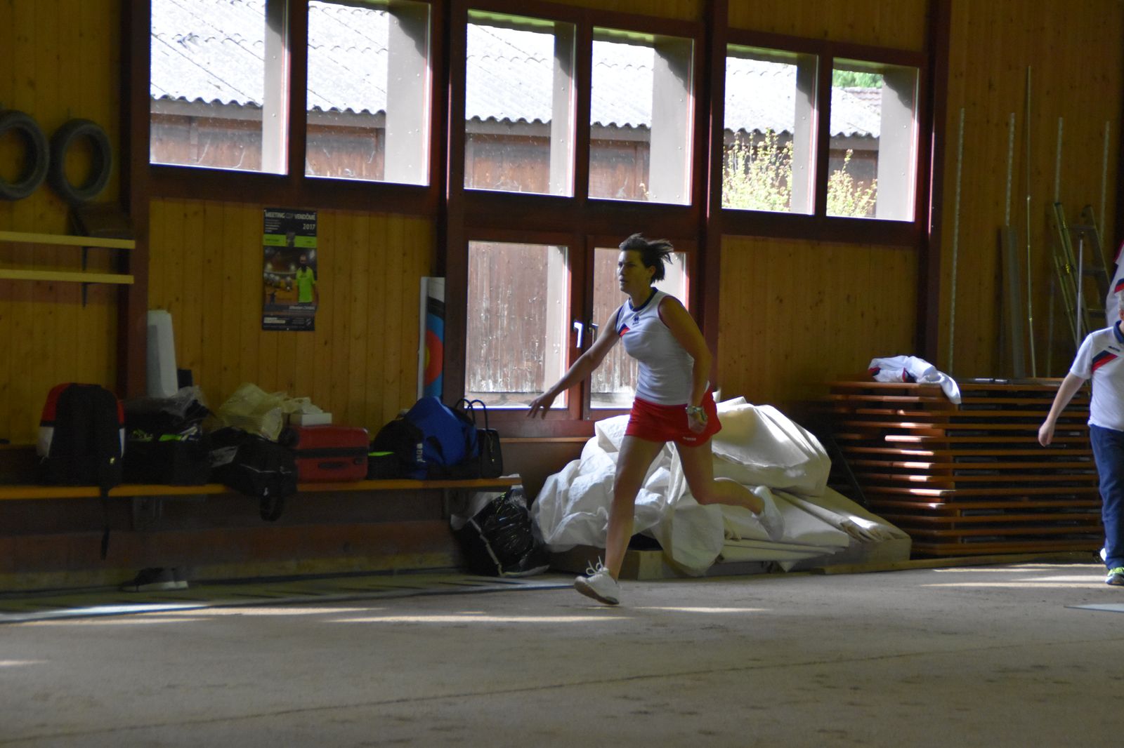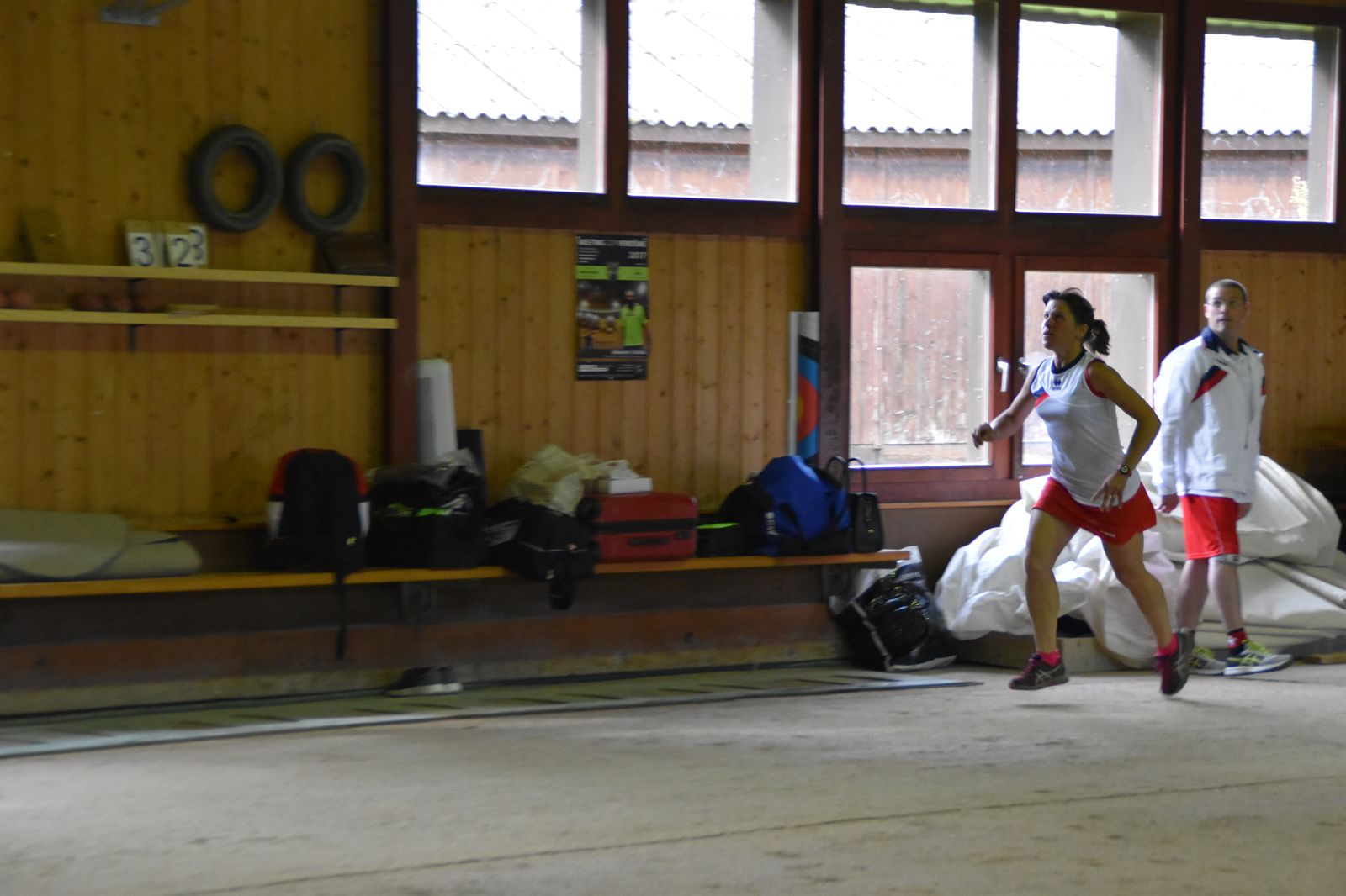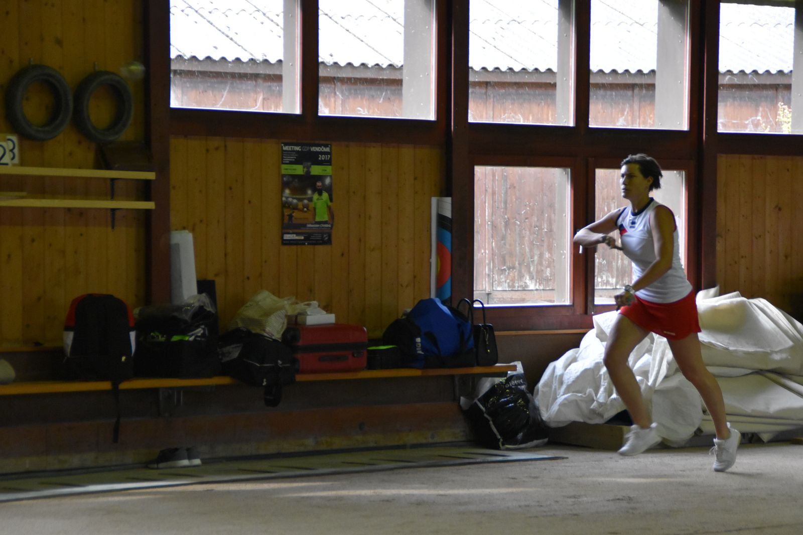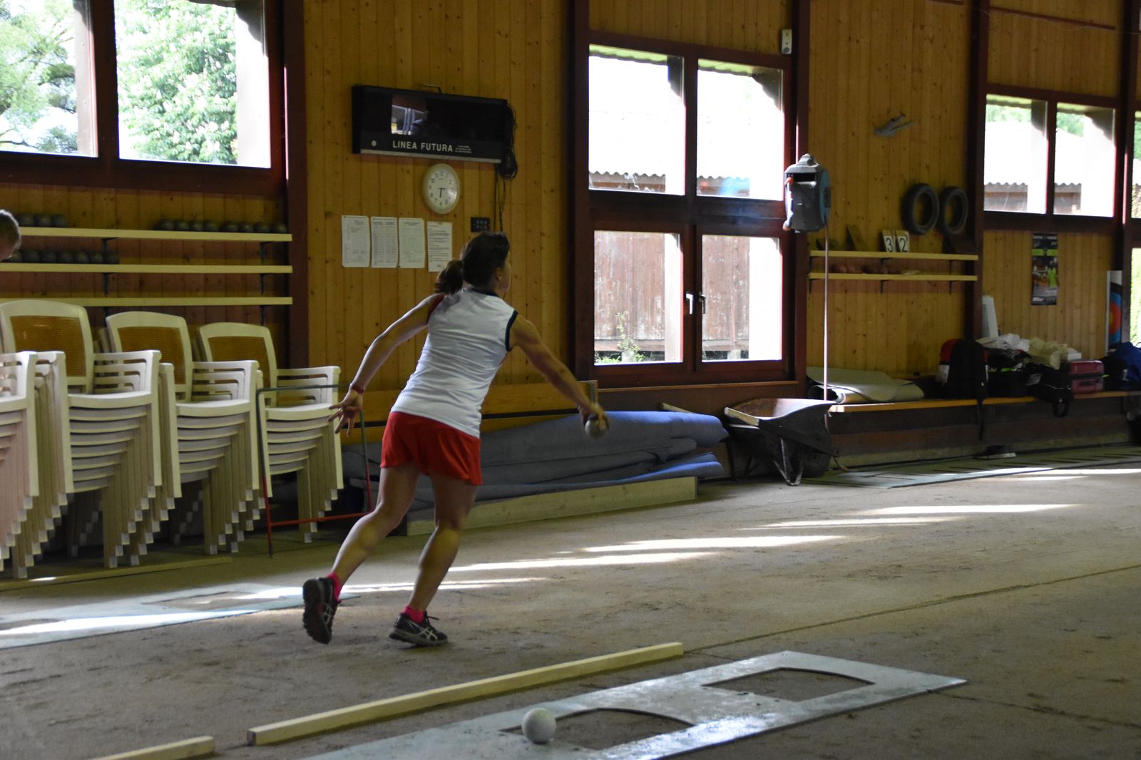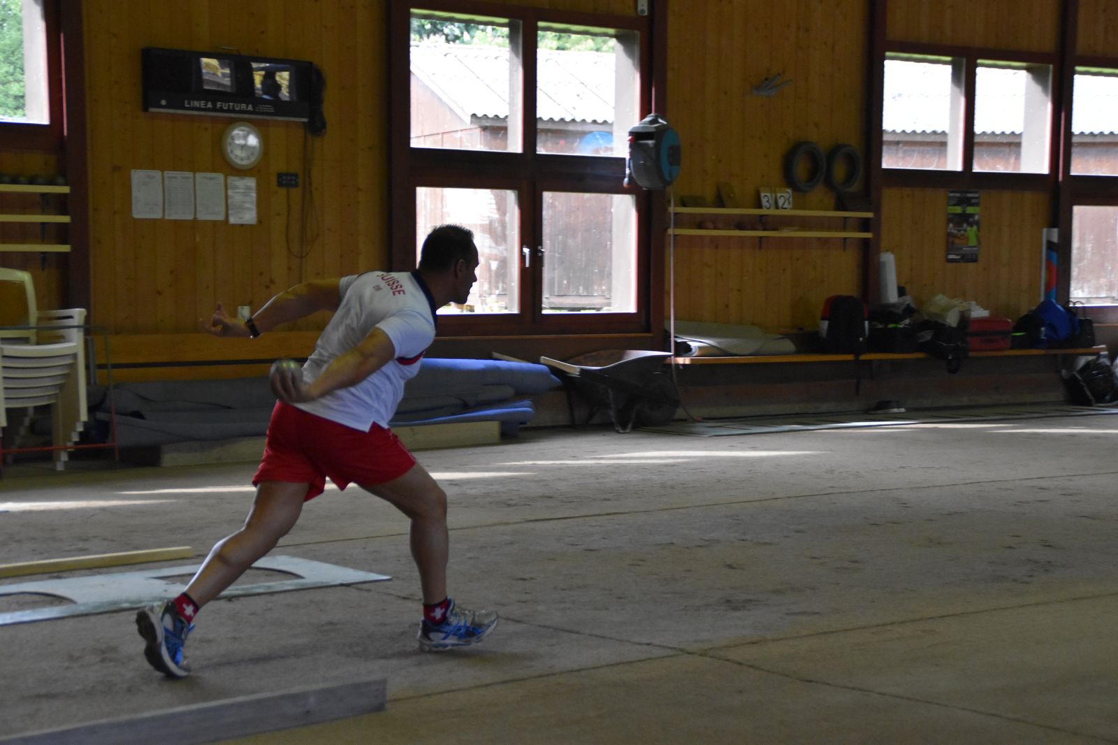 Boulodrome d'Yverdon-les-Bains et échauffement de l'équipe suisse pour sa démonstration.